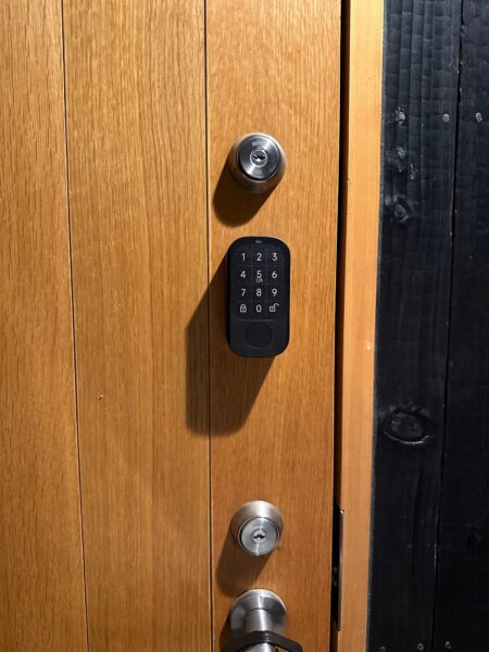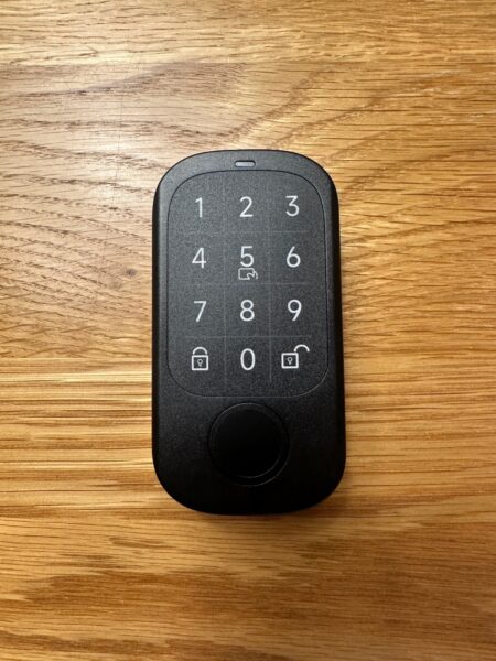 これは玄関ドアの「屋外側」に付けるもので、指紋登録と暗証番号登録ができるので、帰宅時に指をそっとかざすだけで開錠できる優れもの。スマホも操作せずに指一本で簡単に開錠できてしまいます。暗証番号も8桁を登録したので、セキュリティもまず問題ないでしょう。