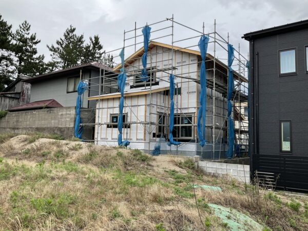 こんにちは!現在の新潟市中央区の現場ですが、木工事を進めております。外周部では耐力面材であるダイライトを張りました。その後、透湿防水シートを巻いて縦胴縁を打ちました。今週初めに現場にてサッシの取付を行いました。これからさらに横胴縁を入れてから杉の下見板を外壁に張っていきます。外壁を張る前に防水検査を受けます。今回の敷地は準防火地域で軒裏にケイカル板を張る予定にしています。内部では1階の床合板を敷きや構造金物の取付を行っております。玄関ドアはYKKのヴェナートの標準枠を使用しています。標準枠はサイドの建枠が伸びている形をしています。その伸びている長さ分ですが、玄関土間を下げてコンクリートを打設しています。