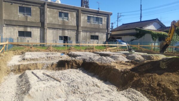 現在建築中の中央区の現場ですが、今週から基礎工事を開始しました。工事に先立ち遣り方出しを行いまして、建物の高さや位置や対角寸法も問題なく掘削に入りました。バカ棒に出した各高さを確認しながら掘削し、砕石敷き転圧を行っています。工事の方は盆前に躯体コンクリートまで打設する予定です。工事がスムーズに進められるように調整していこうと思います。