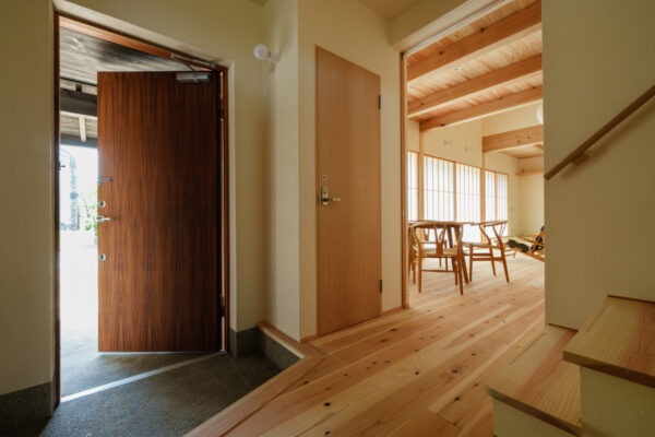 今年竣工しました、「道上の家」は玄関を入ったら少しの共有スペースがありその先はLDKとなっておりホール部分の面積は小さいです。主要な出入り口の建具を引戸とすることで建具を開けていてもスッキリとLDKとホールをつないでくれます。こういったホール(共有スペース)を小さくすることで建物の面積が小さくすることができます。最近の住宅は高気密高断熱、全館空調、物価の高騰など様々なことを考えながら家づくりを計画していきます。これらのことの考えながら密度の濃い住宅づくりが出来たらなと思います。