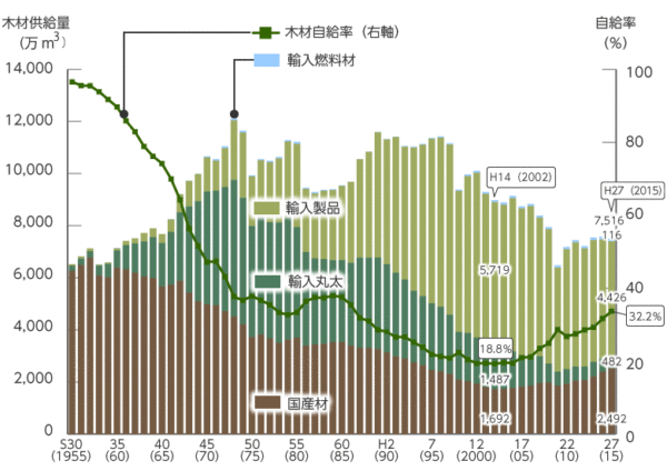 今回の木育教室のために私自身が林業について勉強をしました。日本の状況は木材自給率をみると国産材が輸入材に押され、供給量が減ってしまっています。昔は100%近くありましたが、18.8%まで下がってしまいました。R3年度は41.1%とのことで少し改善傾向にありますが、日本の人工林の多くが伐採時期を迎えている状況なので、伐採して使って植林するという循環を促さないといけません。