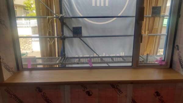 現在建築中の西区の現場ですが、内部にて出窓カウンターの取付を行いました。これから内部では天井板の取付や床フローリング貼りを進めていきますし、外部では外壁板張りや、そとん壁の作業を進めていきます。