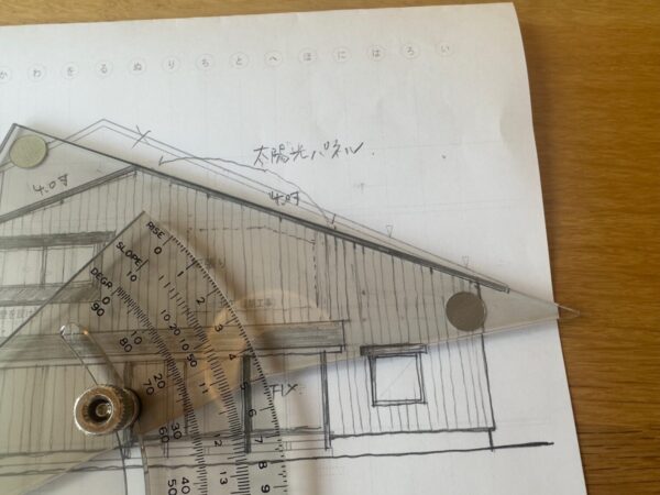 ファサードは、屋根の勾配でかなり印象が違ってきますので、いろんな屋根勾配を検討します。このスタディは手書きでやるのが一番なのですが、そんな時、勾配定規という道具を使います。