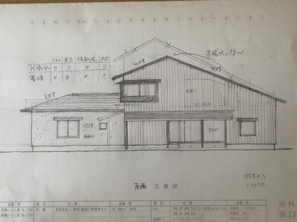 当初、佐渡の家はロフトを設ける設計で進んでいたのですが、打ち合わせの中でロフトの優先順位を再度ご検討いただき、ロフトを無くす方向で進むことになりました。ただ、今回のロフトは「真野湾を望む隠れ部屋」的な楽しい魅力もたくさんあったので、無くすことをネガティブに感じていただきたくないなぁという想いで(私の)、現在、全力でファサードを検討しています。建物が出来上がってからの建主さんとの打ち上げの際に、「竹村さん、あの時ロフト無くして良かったですよ!」と言っていただけるように、です。
