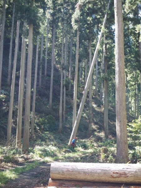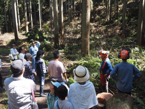参加者の皆さまの一番の目的と言っても良い伐採現場見学では、2本の木の伐採を見ることができました。木こりさんからの林業の仕事の話や参加者様からの質問が積極的に出て、皆さんの興味関心が深いことを感じました。