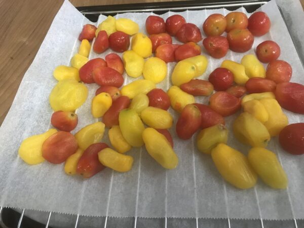 ちなみに畑で育てていたプチトマトは大量に実ったのですが、スタッフは全然持ち帰ってくれないので、収穫して持ち帰りドライトマトを作ろうとしましたが、暑くて面倒になり冷凍庫に入れっぱなしに‥‥。やっと解凍して皮を取り除きオーブンに入れてセミドライトマトを作りました。