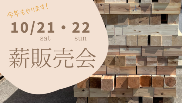 また、先週告知させていただきました「薪販売会」ですが、こちらは10月21日(土)・22日(日)(22日は予備日)に開催します。薪の確保がまだ足りていない方、来年以降の薪の確保をしたい方、ぜひ予約をお願いします!薪の販売と同時に、建築現場で出る端材を集めましたので、焚き付けにいかがでしょうか。今回は前回よりも袋のサイズが大きいため、1袋300円、最大1家族様3袋までとさせていただきます。焚き付けだけの購入も可能となっています。この機会にぜひ購入してください。