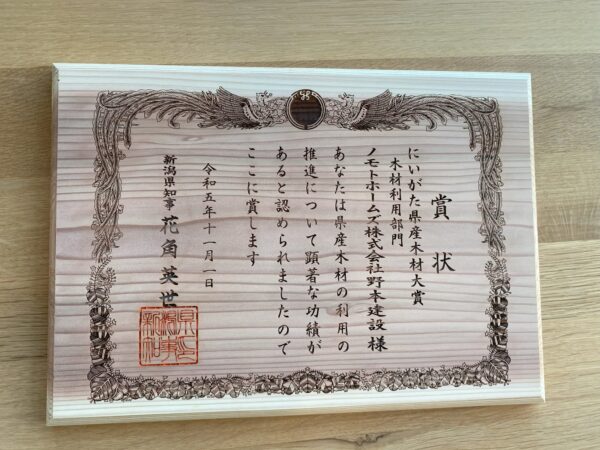 ノモトホームズは「木材利用部門」で新潟県知事賞を受賞しました。