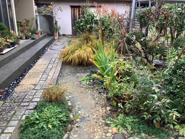竣工から10年を迎え、その間に植物がお好きな奥様、ご主人様が時間をかけて育てた植物と同じく時間をかけて敷き詰められた庭の石。