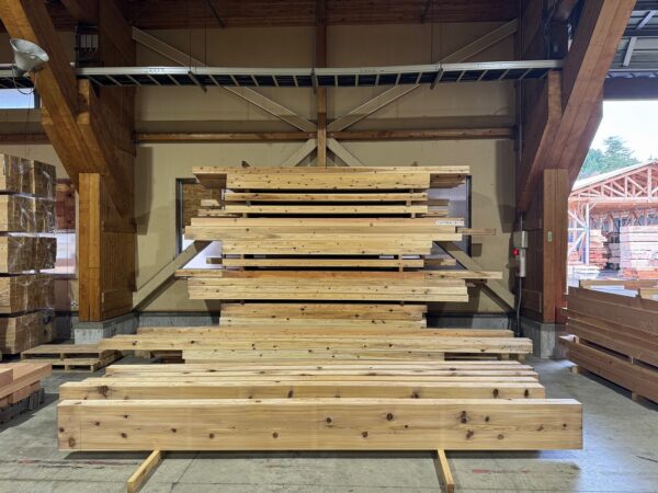 構造材の加工前検査に行って来ました。含水率や木のねじれ、抜け節の有無や梁材の位置、そして柱の向き等の確認をしてきました。一棟ごとに必ず確認と指示を行っています。