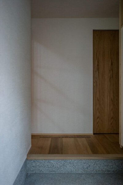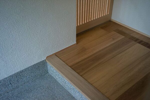 玄関の框もオークで統一。杉に比べると何倍も高いですが、、、フローリングと合わせるのがポイント。上がり框だけ樹種を変える方法もありますが、私は統一した方がきれいだと思っています。ただし、例えば建て替え等のケースでは、以前のお住まいで使われていた床柱や式台を上がり框にリメイクするというのは断然アリだと思います。そこで樹種が合わなくても、家族の歴史が紡がれていくというストーリー性があれば、それに勝るものはありません。