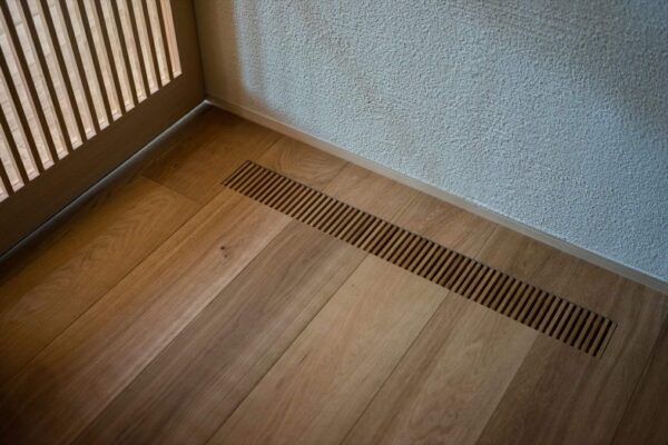 床下エアコンのガラリもオーク材で統一。樹脂系のガラリもありますが、ノモトホームズでは素材感を優先して、フローリングに合わせた木製ガラリを使っています。