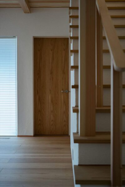 建具も面材はオークの練り付け材で統一しました。木目は、木の表情の異なる「柾目」と「板目」を指定することができますが、今回はよりオークの持ち味が感じられる板目でお願いしました。表面にはリボスカルテッドという自然オイルを塗装し、濡れ色が美しい仕上がりになりました。やはり板目にして正解でした!