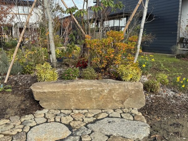 HARUMACHI ガーデンの石のベンチ。造園屋さんがクレーンで吊り上げて据え付けました。腰かけている様子は、見たことがないです。お尻が冷たくなるからでしょうか?