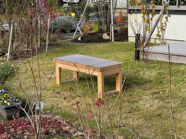 大工さんが作ったヒバ材のベンチ。遊具の隣にあるので、親子で時々腰かけてくれます。ヒバは水に強く、腐りにくい材質です。もう少しで屋内にかたづけます。