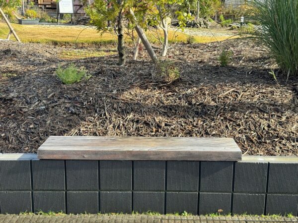 歩道脇のブロックに大工さんが取り付けた、ケヤキ材のベンチ。お年寄りが時々、腰かけてくれます。