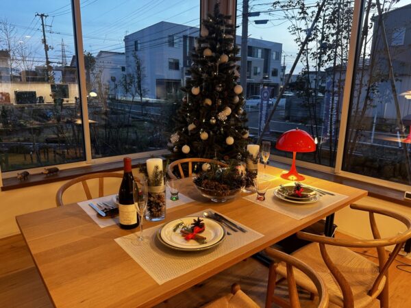今回のライブ配信は、広報スタッフの渡邉さんが企画してくれたものです。総務スタッフの松尾さんも、松ぼっくりツリーづくりやクリスマスツリーの飾り付け、HARUMACHI coffee の配信準備等、積極的に取り組んでくれていました。どんな配信になるのか、当日までやってみないと分からない部分もあったのですが、朝からいろいろと準備をいただいて、開始時間10分前にモデルハウスに行ってみるとめちゃくちゃいい感じの設えがあって、田中くんと2人、びっくりしてテンションが上がりました!松ぼっくりやトウヒ、南天、ローズマリー、柊を使って、モデルハウスに元々あった食器と組み合わせてすっごくオシャレになっていました…今までのノモトホームズになかったオシャレなセンス…(笑)女性チームのセンスや目の付け所は、さすがでした!