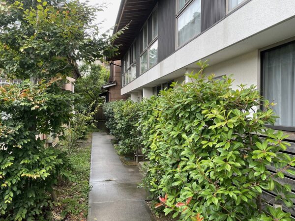 新潟市にある、泉 幸甫さん設計・監理の木造集合住宅です。通路が緑で囲われています。洗い出し仕上げの通路です。