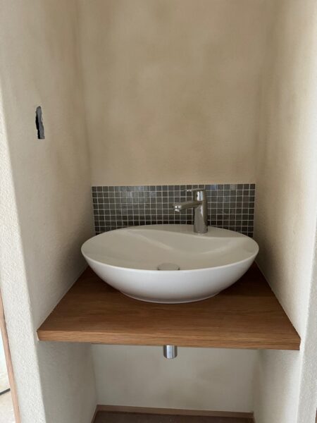 漆喰とタイル仕上げの壁。手洗い器を取り付けると、洗面スペースにおしゃれで美しい雰囲気を与えることができます。