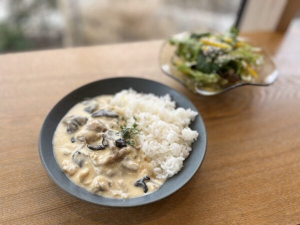 鶏肉と玉ねぎ、平茸が入っていて、香りや食感がとても良く、クリーミーなソースがご飯とよく合うので、ぜひ食べていただきたいです!