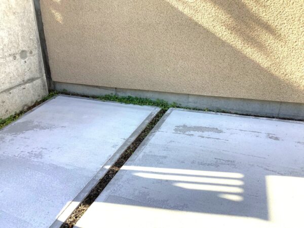 土間間や基礎の間に10cmに満たない隙間を残しその隙間に植えられてたグランカバー用の小さな緑がコンクリート冷たい質感を柔らかなものに。
