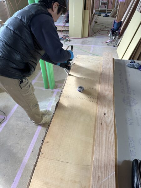 昨日ですが、カウンター材に使う一枚板を社長より現場に搬入してもらい板の向きや使う場所を棟梁と打ち合わせに行ってきました。これから加工してもらい、仕上りがとても楽しみです。