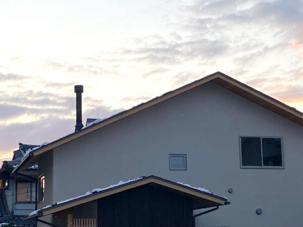 夕暮れ時の割野の家。薪ストーブが印象的。