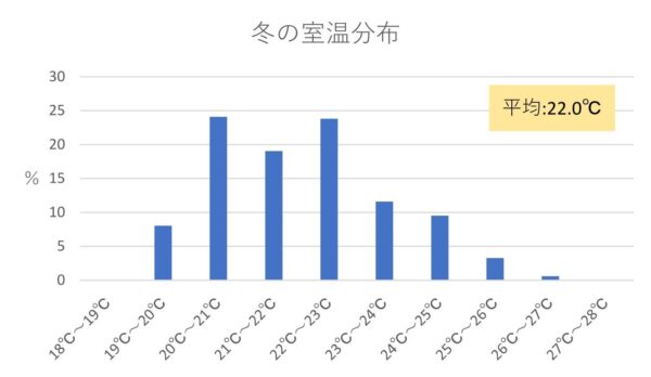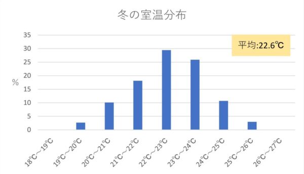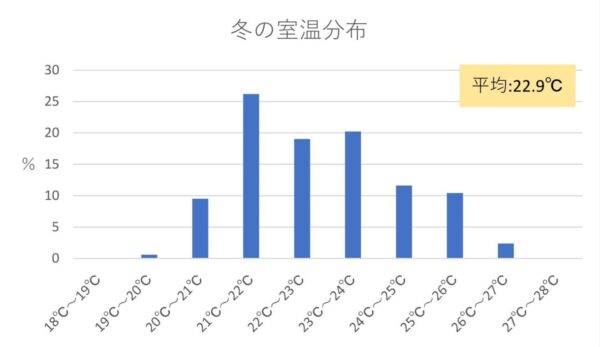 室温分布をみてみますと、20℃~23℃が全体の約62%をしめていて、非常に安定して快適な室温であったことがわかります。