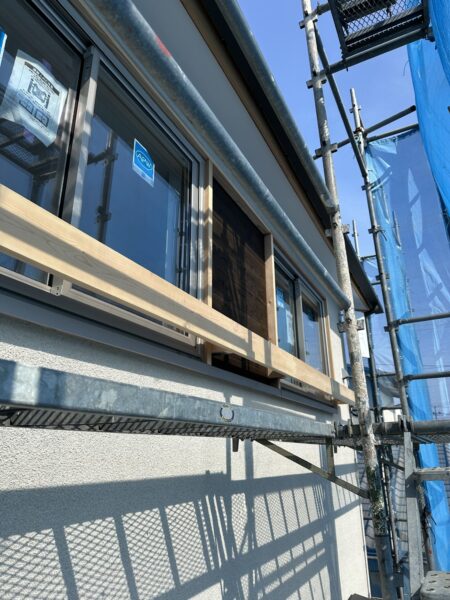 外観部分もこだわりポイントがあり、樹脂窓の周りに木枠を回し、木製建具風に仕上げてみました。雨が溜まりやすい下部の木枠部分には板金をまわすことで長持ちをするように工夫しております。