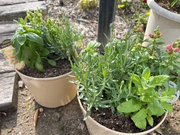 カフェの入り口付近には、先日のキッチンガーデンで竹村さんと田中さんが作ったハーブの寄せ植えもあります。