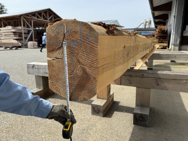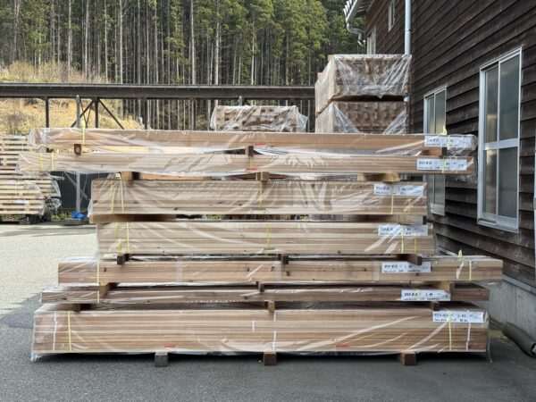 競りで購入した丸太を太鼓に製材して阿賀野市の倉庫に長く寝かしておきました。山北木材加工協同組合の高橋さんとLDKの天井部分に取り付く、イメージをしています。LDKの天井に取り付けることで、その木の息づくような存在感が空間に広がり、住まいに温かみと個性を与えることでしょう。