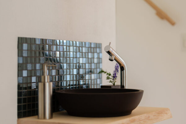 陶器は和のテイストとし、ガラスタイルを使うことでスタイリッシュにまとめました。