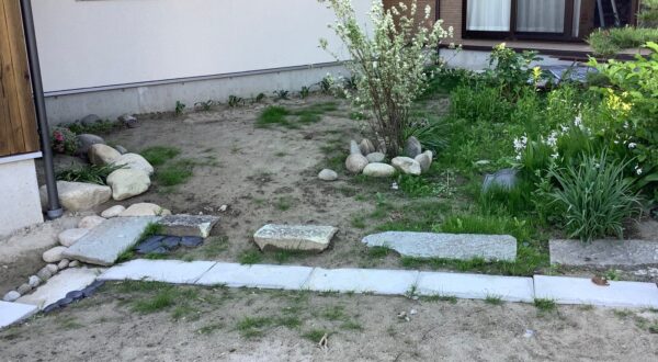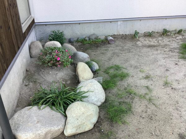 敷地工程差もあって新たに土を敷かせていただき整地をさせていただいて竣工を迎えたのですが、ご実家母屋の庭として多くの植物と樹木が植えられていた緑豊かなお庭でしたがこの度のお住まいを建てるにあたて、整地の際にその殆どを止む無く除去していただいたものものですが、その際どことなく寂しさを覚えていました。