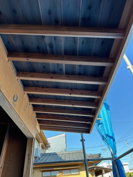 軒裏は垂木と野地板を見せる「現し」という仕上げになります。軒天を貼るよりもコストを抑えられるというメリットがあります。野地板にはウッドロングエコという防腐剤を塗布しています。
