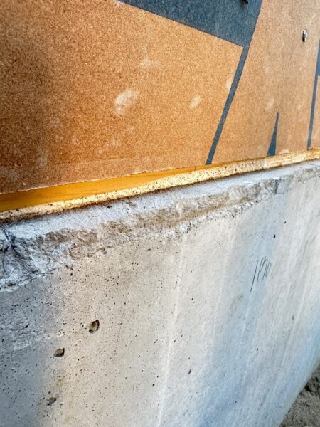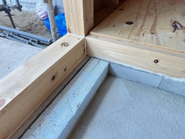 ダイライトは基礎に直接載らないようにしています。これは、万が一雨水が基礎上に降りかかった時でもダイライトが下端から水を吸い上げないようにするための配慮です。
