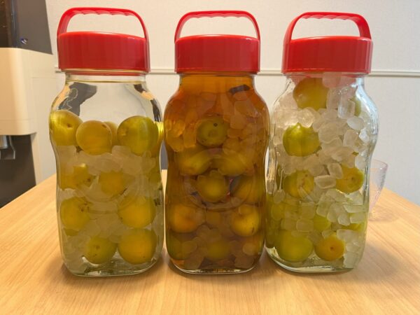 1つずつ丁寧に洗って、水気を拭いて、爪楊枝でヘタを取りました。そのあとは、保存容器に氷砂糖と交互に入れ、ホワイトリカー、ブランデー(渡邉さんのおすすめ)、りんご酢をそれぞれいれて梅酒2種類、梅シロップ1種類を作りました。