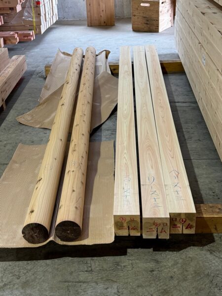 木材の乾燥具合、梁材の向き、柱の向き、抜け節等、木材全体をを確認しました。建物の構造に関する問題を事前に発見し、修正することができ建物の耐久性や安全性、意匠を確保するために行いました。今回は村上森林組合の特別の機械で製材した背割りの入っていない、芯去の丸太材使用しています。どんな風情になるか完成が待ち遠しいです。