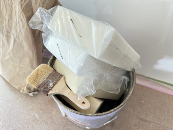 中塗りが終わると上塗りをして、上塗りが少し乾いたタイミングでスポンジを使って横に引いてテクスチャーをつけていきます。