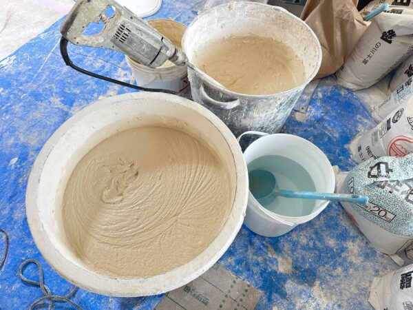 ノモトホームズの漆喰は既調合(あらかじめ調合された漆喰)ではなく、現場で職人さんが練ってこしらえる漆喰です。