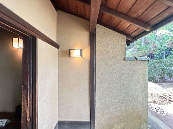 玄関の照明器具も絶妙な高さ。軒先下の小壁は途中で瓦で見切って、軒裏や垂木に干渉しないようにしています。この感じ、私もめちゃくちゃ好きなので思わずグッときました。