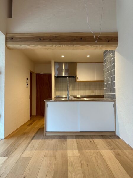 キッチンに架かる梁は、丸太をそぎ落としたもので太鼓梁と呼ばれるもの。
