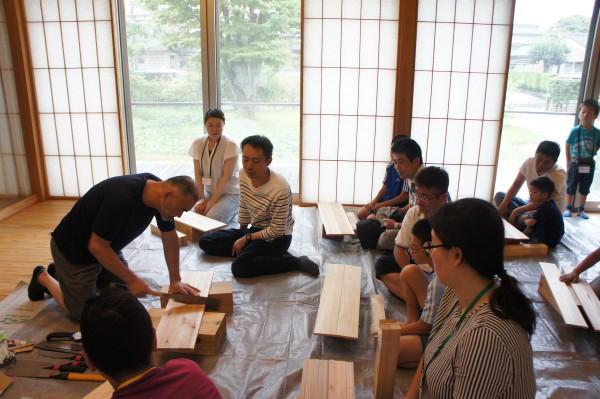 写真のように、棟梁の榎本さんから実際に一つの本棚をお手本に作りながらのレクチャー。