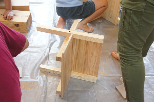 杉板をのこぎりで切って紙やすりで整え、ドライバーを使ってビスで部材を固定していきます。