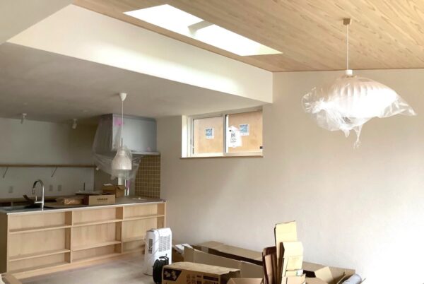 仕上がった室内では照明器具も取付されて、ダイニングにルイスポールセン・トルボー220を広間にはネルソン ソーサー バベル ペンダントを配置、ソーサーペンダントはシェードの面積が広くあらゆる室内空間に美しいデザインと柔らかな明かりをもたらします。