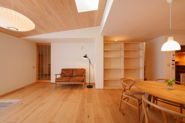 勾配天井で伸びのある空間構成に加えて、ダイニングとの境にある2連のトップライトからの自然光の日差しが、置かれた緑の植物と相まって何とも言えない豊かな表情を醸しだしてくれたいます。