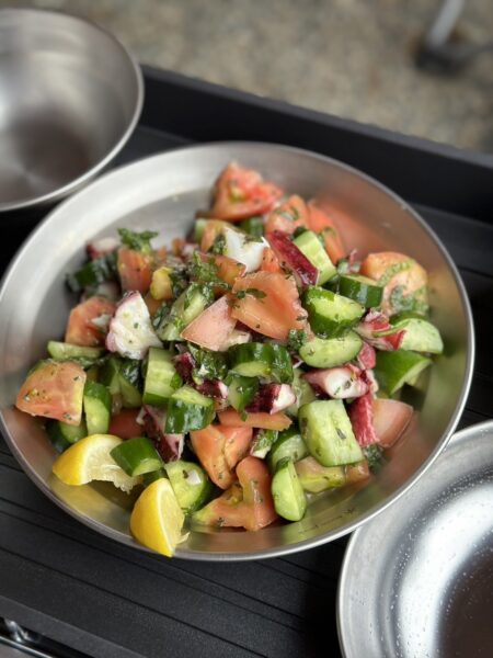 キャンプ飯は地元のスーパーで買った食材を使って、サラダやスープ、お肉にアヒージョ、リゾットなど、Uさんの指導のもと、みんなそれぞれのナイフで食材を切りながら、協力して作っていきます。