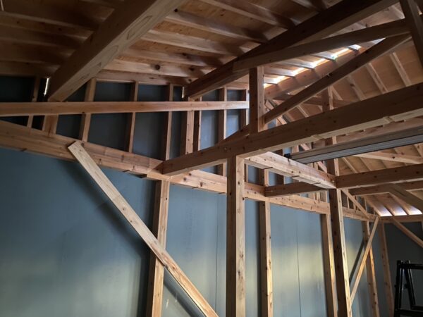 今日一日で屋根と外部の面材まで進みました。