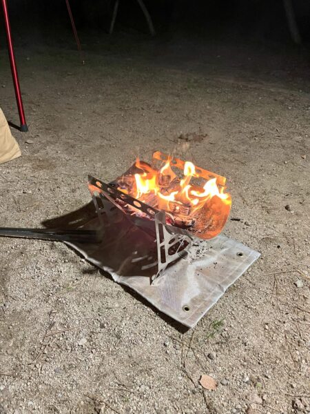 おつまみを食べながら、焚火を眺めました。炎の揺らめきと音は永遠に見ていたくなるほど癒されます。自宅を建てるなら薪ストーブが欲しいなぁ、と強く思う瞬間です。