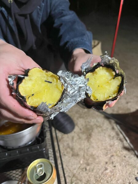 今回は初めて、焚火の中にさつまいもを入れてみました。アルミホイルに包んで片面15分ずつ、途中で上下を逆にして完成です。ほくほくの美味しい焼き芋をデザートにしました。