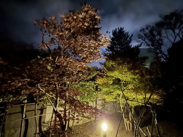 暗くなりライトアップされた庭の紅葉も、また風情があります。部屋を暖め障子を開けて楽しみたいと思います。